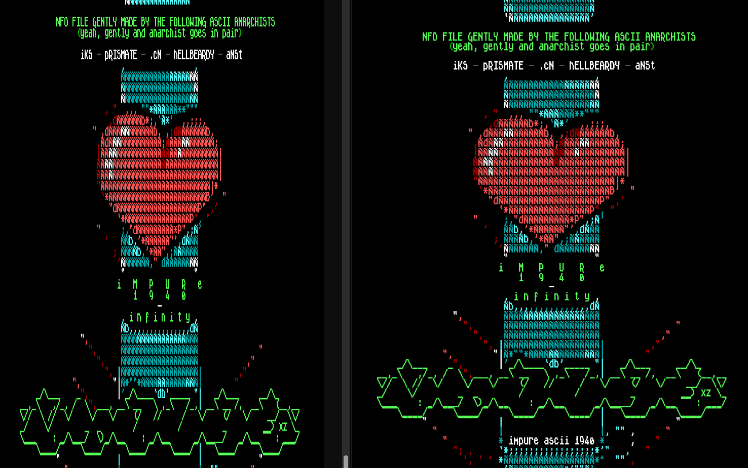 I’ve been working on a conversion tool for ANSI > UTF8. I’m aiming for as close to 1-1 visual match as possible, getting increasingly better results. I noticed this discrepancy when testing with impure81. My terminal is on the right, the reference/web PNG is on the left. Is the image supposed to be elongated vertically like this?